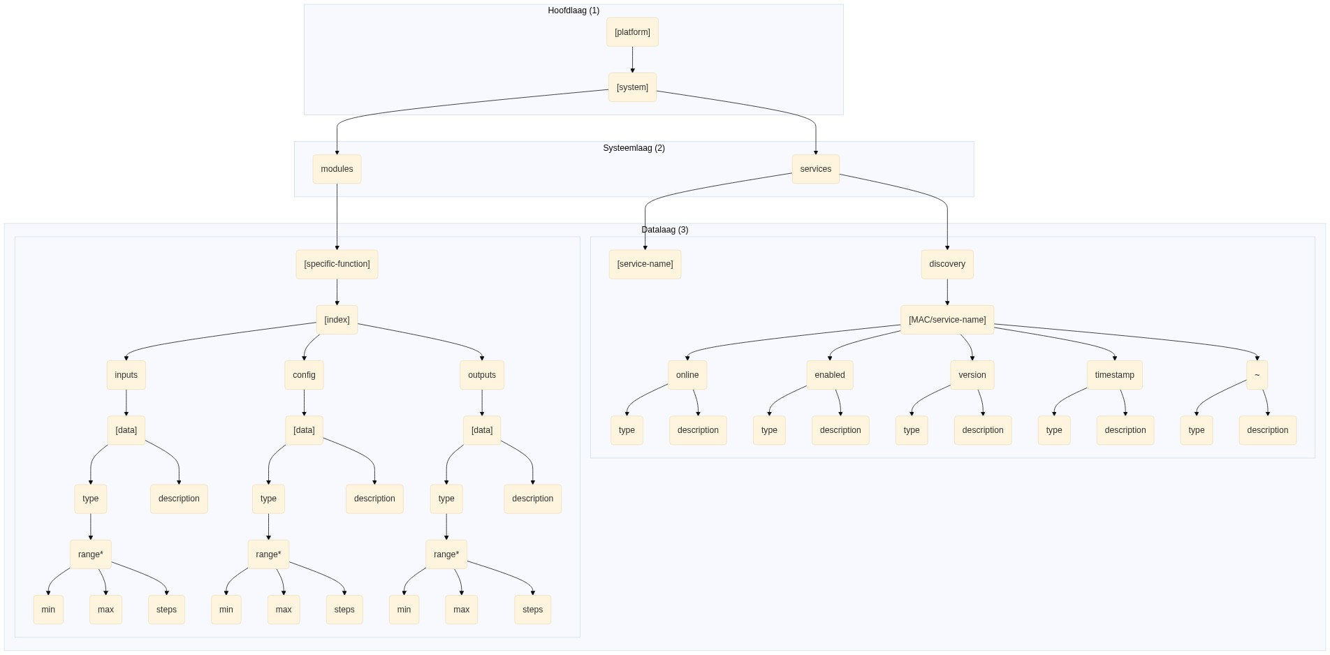 endDe hoofdlaag geeft aan door middel van de [platform]notatie aan welk van welk platform de structuur wordt bekeken. Vanuit de deze notatie kunnen er meerde platformen aan elkaar worden gekoppeld. Dit doordat de platforms door de [platform]notatie van elkaar kunnen worden gescheiden. Dit heeft als voordeel dat de overzichtelijkheid en leesbaarheid hierdoor wordt vergroot.